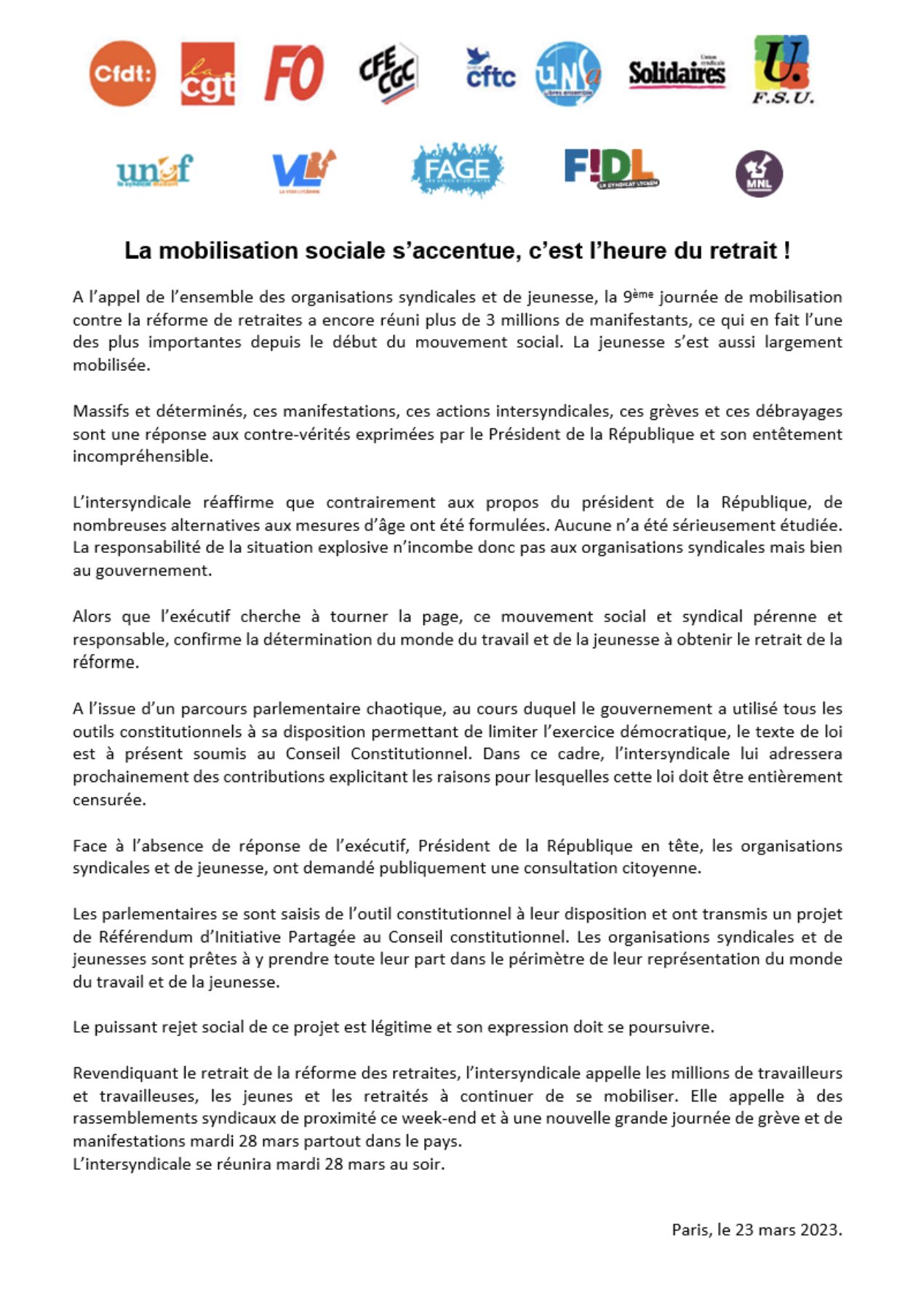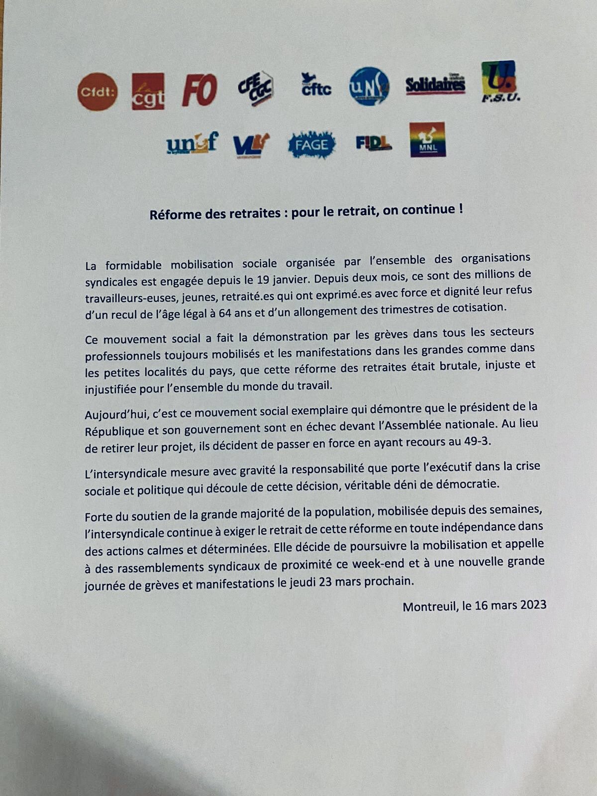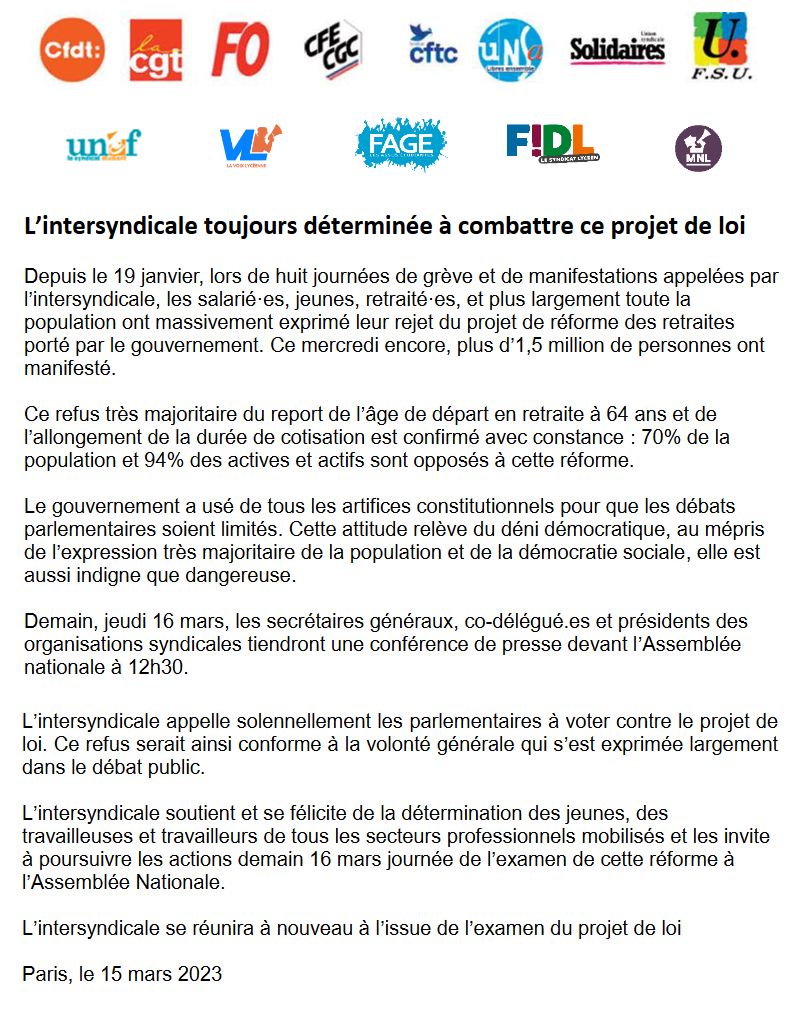 L’intersyndicale décide de poursuivre la mobilisation et appelle à des rassemblements, syndicaux de proximité ce week-end et à une nouvelle grande journée de grèves et manifestations le jeudi 23 mars prochain.