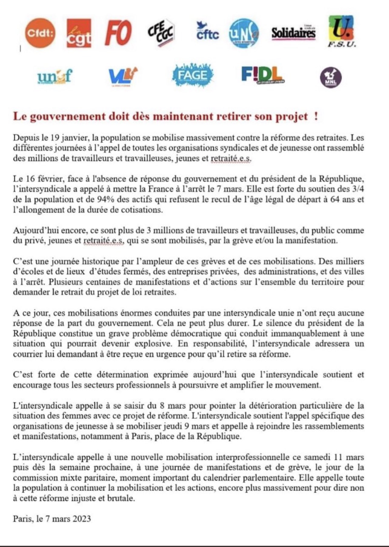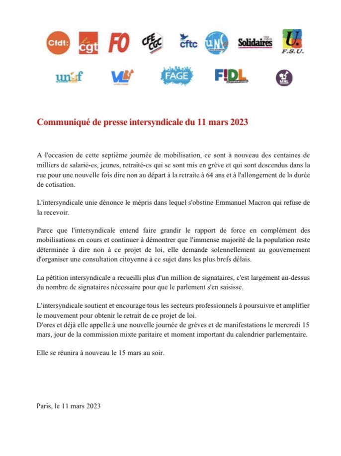 L’intersyndicale appelle à une nouvelle mobilisation interprofessionnelle ce samedi 11 mars puis dès la semaine prochaine, à une journée de manifestations et de grève, le jour de la commission mixte paritaire, moment important du calendrier parlementaire.