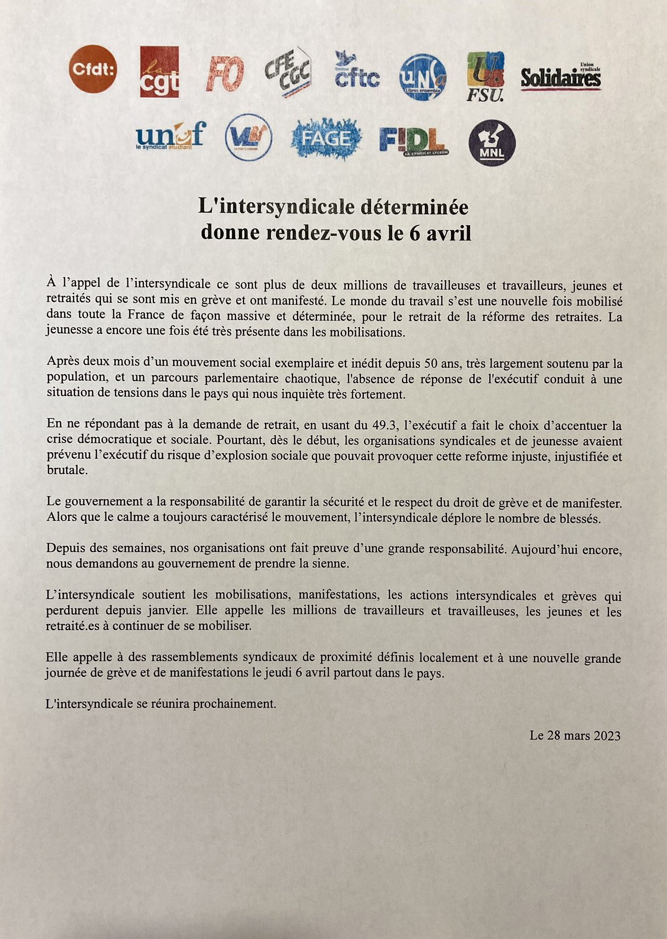 L’intersyndicale appelle à une 10e journée de mobilisation mardi 28 mars.