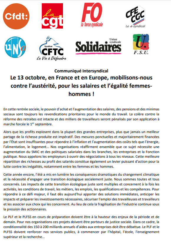 Communiqué intersyndical – Le 13 octobre, en France et en Europe, mobilisons-nous contre l’austérité, pour les salaires et l’égalité femmes- hommes !